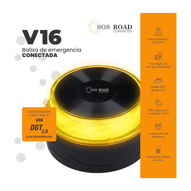 La baliza de emergencia SOS ROAD CONNECTED ha sido diseñada y desarrollada conforme a las especificaciones de la regulación V16 según el Real Decreto 1030/2022, de 20 de diciembre, por el que se modifica el Real Decreto 159/2021, de 16 de marzo, por el que se regulan los servicios de auxilio en las vías públicas.